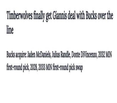 雄鹿得到:麦丹+兰德尔+迪文芩佐+32年首轮+28、33年首轮互换。