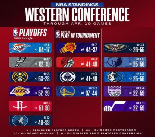 在快船输球开拓者赢球的同时,同天比赛中雷霆输球、马刺赢球、掘金赢球、湖人赢球、火箭输球、森林狼赢球、太阳输球、勇士输球,西部前十中已经有6支球队敲定排名。