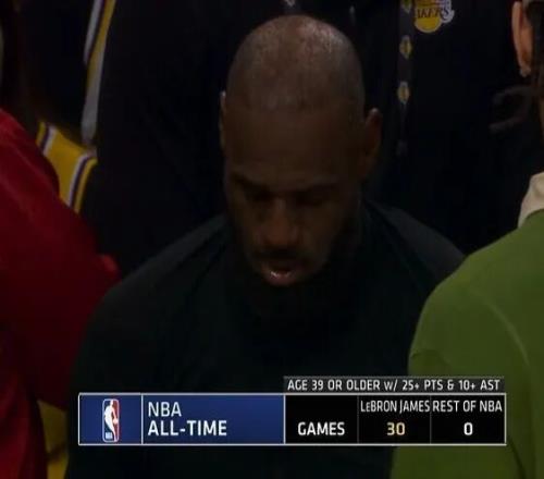 这是詹姆斯39岁后第30次砍下至少25分10助,放眼NBA历史,只有詹姆斯一人做到了30次,其余所有球员0次