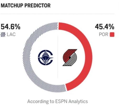 这场比赛不只是附加赛的关键卡位对决,甚至有可能提前预演附加赛第二轮、争夺西部最后一张季后赛门票的较量,双方必然会拼尽全力争胜。本月初两队交手时,开拓者曾在客场114-104击败快船,结合开拓者近期的状态,此番坐拥主场优势,他们的取胜机会或许更大。ESPN预测本场比赛:快船胜率54.6%,开拓者胜率45.4%。