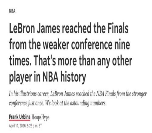 詹皇进总决赛含金量遭质疑!9次从实力较弱分区突围:NBA史上最多