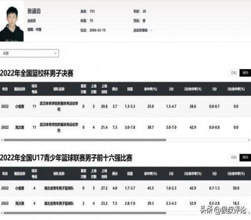 网友晒出了两人的参赛信息,张涵泊,2006年生,湖北青年男篮、武汉体育学院附属体校球员,2021-2022年U15/U17赛事参赛。