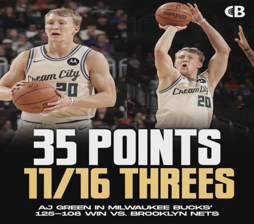 AJ-格林单场命中11记三分,打破雄鹿队史纪录,此前是由雷阿伦(2002年)和利拉德(2024年)共同保持的10记。 AJ-格林本赛季命中227记三分,超越马利克-比斯利(224)升至队史第二,仅次于雷阿伦的229记(2001年)。