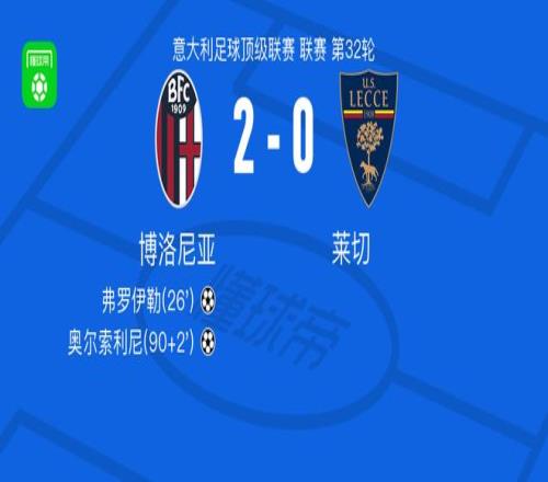 北京时间4月13日意大利足球顶级联赛第32轮,博洛尼亚主场对阵莱切。比赛中,弗罗伊勒为博洛尼亚率先取得进球,随后贝尔纳代斯基助攻奥尔索利尼再下一城。最终博洛尼亚以2-0战胜莱切。