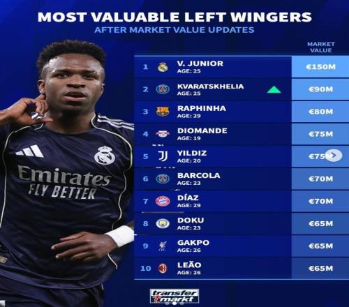北京时间4月13日,德转列出了世界足坛左边锋身价前10,皇家马德里的维尼修斯以1.5亿欧元排名第一,巴黎圣日耳曼的克瓦拉茨赫利亚9000万欧元排名第二,巴塞罗那的拉菲尼亚8000万欧元第三。