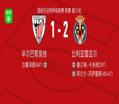 北京时间4月13日西班牙足球甲级联赛 联赛 第31轮,毕尔巴鄂竞技主场对阵比利亚雷亚尔。毕尔巴鄂竞技古鲁泽塔破门。比利亚雷亚尔塞尔希-卡多纳破门,阿尔方-冈萨雷斯破门。最终比分毕尔巴鄂竞技 1-2 比利亚雷亚尔。