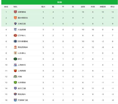 北京时间4月12日,中超联赛第五轮结束争夺,成都蓉城客场2比1逆转绝杀北京国安,继续领跑。云南玉昆客场4比3击败深圳新鹏城,排名第三位。重庆铜梁龙2比1击败武汉三镇,排名第二。本轮之后,成都、重庆和云南保持强势,泰山队拿到3分,排名升至第8,申花击败海港,积分清零,为1分。