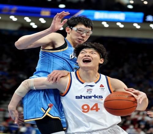 新华社照片,北京,2026年4月12日 4月12日,北京北汽队球员周琦(左)在比赛中防守上海久事队球员王哲林。 4月12日,在2025-2026赛季中国男子篮球职业联赛(CBA)常规赛第38轮比赛中,上海久事队客场88比83战胜北京北汽队。 新华社记者 张晨 摄