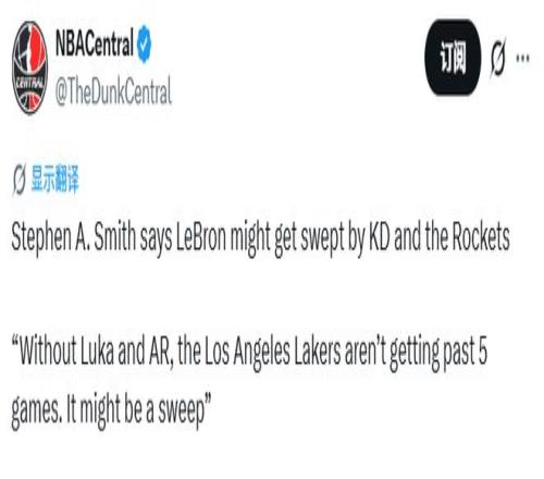 “我没直接说横扫的唯一原因,就像2001年我评价艾弗森那样。当时我说艾弗森能偷下一场。我也愿意相信伟大的詹姆斯同样能做到,但也就仅此而已了,湖人最多撑五场就回家。这轮系列赛不会拖很久,除非东契奇和里夫斯能复出。”