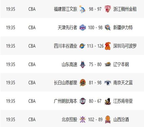 2025-2026赛季CBA常规赛进入最后阶段,本周一晚上迎来七场对决,事关季后赛的席位之争,具体比赛结果如下: