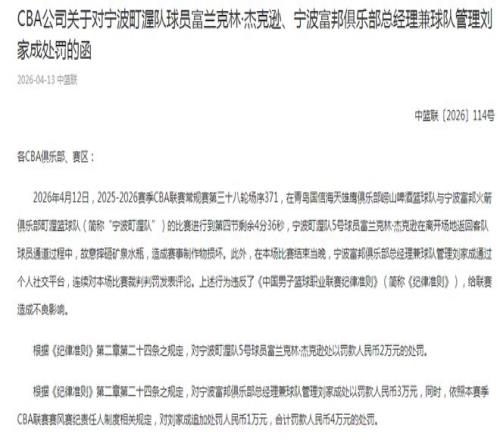此外,本场比赛结束当晚,宁波总经理兼球队管理刘家成通过个人社媒,连续对本场比赛裁判判罚发表评论。上述行为违反《中国男子篮球职业联赛纪律准则》,给联赛造成不良影响。