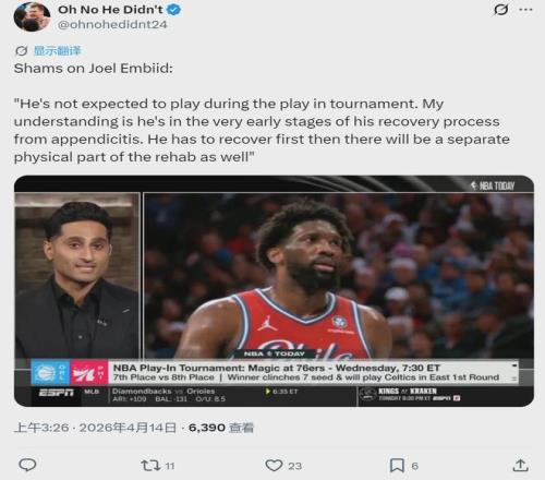 北京时间4月14日,NBA名记Shams报道,76人球星恩比德因阑尾切除手术,仍在恢复阶段,预计附加赛报销。76人常规赛45胜37负排名东部第7,第一场附加赛将对阵魔术。如果76人输掉比赛,还要跟热火和黄蜂的胜者再打一场。