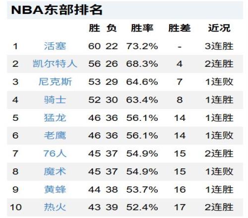 东部前10分别是活塞、凯尔特人、尼克斯、骑士、猛龙、老鹰、76人、魔术、黄蜂和热火。