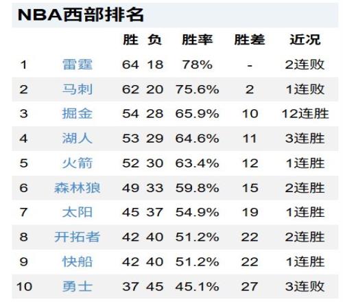 西部前10是雷霆、马刺、掘金、湖人、火箭、森林狼、太阳、开拓者、快船和勇士。