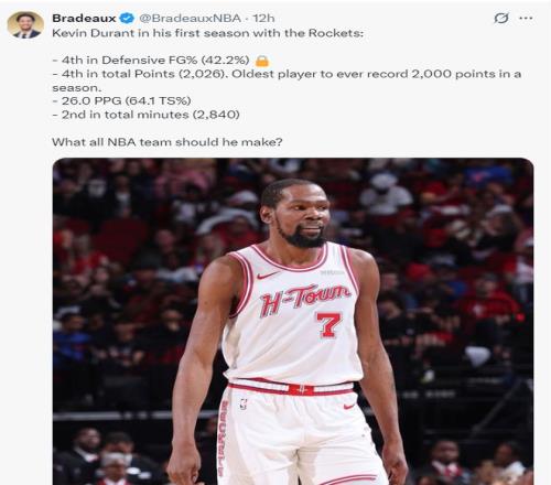 火记还晒出了杜兰特的数据作为佐证,杜兰特在加盟火箭的第一个赛季,防守对手命中率42.2%联盟第四,总得分2026分联盟第四,是史上单赛季达成2000分最年长的球员,场均26分真实命中率64.1%,总登场时间2840分钟联盟第二。