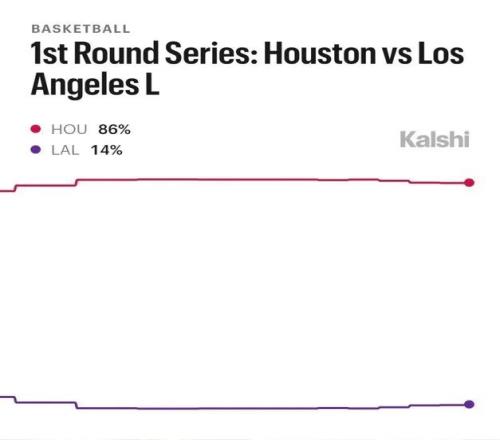 预测平台Kalshi发布了湖人vs火箭系列赛的晋级概率,火箭高达86%,湖人仅14%。