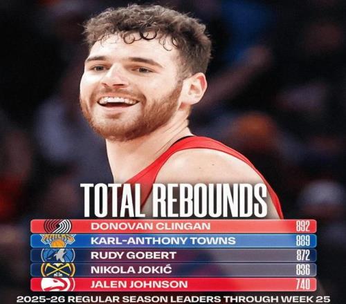 这个赛季克林根出战77场比赛并且全部首发,场均27.2分钟时间里可以拿到12.1分11.6个篮板2.1次助攻和1.7次盖帽,投篮命中率52.0%,三分球命中率34.1%。今天NBA公布了本赛季常规赛球员篮板榜,开拓者队克林根以892个位居榜首,排名第2的是唐斯(899个),第3是戈贝尔(872个);场均篮板榜克林根排名第3,第1名是约基奇(场均12.9个),第2名是唐斯(场均11.9个),文班亚马和戈贝尔场均11.5个篮板,排在克林根后面。