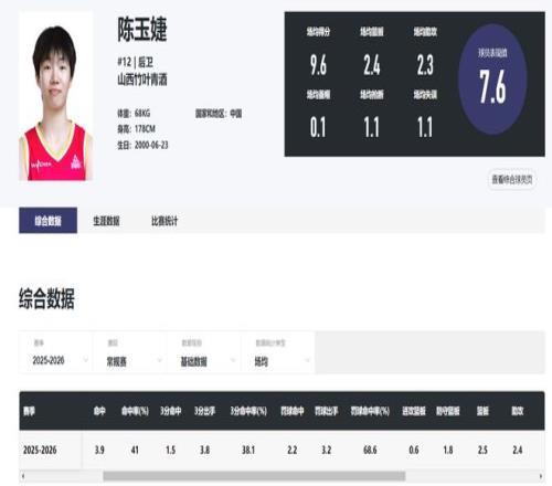 本赛季的常规赛陈玉婕场均26.9分钟,拿到9.6分2.3助攻2.4篮板1.1抢断,命中率41%,三分命中率38.1%,在常规赛她还是一个合格的外线投手、防守者,可进入季后赛数据就下滑不少。