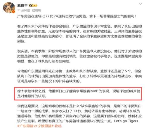 本场比赛,外教拉科维奇给予了徐杰足够的信任,后者也没有辜负这份期望,全场出战35分钟,20中10,三分球11中4,拿到27分5篮板4助攻,得分甚至比小外援奎因还高,媒体人麦穗丰直言:“徐杰掌控球权之后,他重新打出了能竞争常规赛 MVP的表现,现场球迷的喊声就是对他最好的认可。”