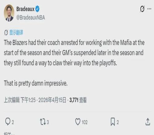 火箭记者Bradeaux点评开拓者的表现:“本赛季刚刚开始时,开拓者的主教练(比卢普斯)因为与黑手党合作被逮捕。常规赛快要结束时,他们的总经理助理又被停职。开拓者依然顽强地杀进季后赛,这真的太特么让人印象深刻了!”