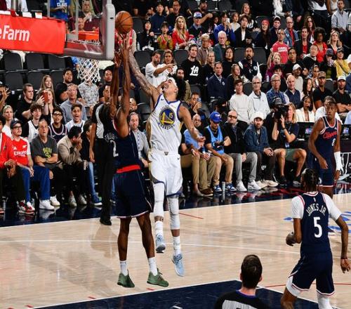 这场比赛快船主场将球馆布置成红色的海洋,在快船的因图特圆顶球馆给客场作战的金州勇士较大的视觉冲击力。科怀-伦纳德当然就是红色海洋的第一核心,他首节6中2拿到6分4篮板3助攻很全面。