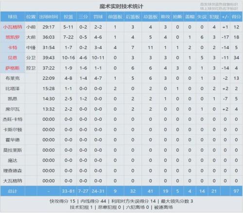 北京时间4月16日,NBA附加赛:魔术97-109不敌76人,将跟黄蜂争夺东部最后一个季后赛名额。魔术状元班凯罗被保罗-乔治锁死,此役班凯罗22投7中,三分5中0,罚球6中4,得到18分5板4助1帽6失误,正负值-17全场最低。