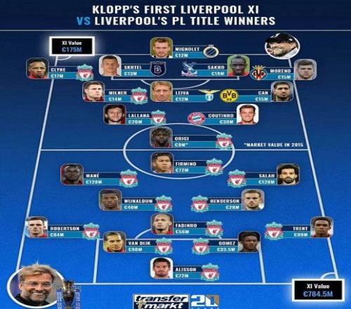 (克洛普执教利物浦第一场首发阵容与夺冠阵容对比)