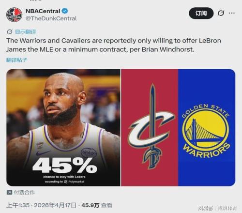 北京时间4月17日,NBA季后赛即将在本周末全面拉开战幕,联盟焦点却提前转向湖人传奇球星勒布朗·詹姆斯。据知名记者Brian Windhorst最新爆料,即便詹姆斯下赛季选择离开湖人,两大热门下家勇士与骑士,也仅愿意为他提供中产特例或底薪合同,彻底击碎了他的高薪离队幻想。