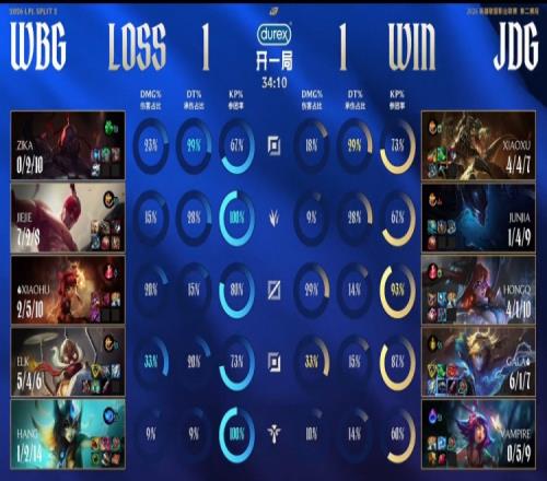中期Jiejie盲僧精准回旋踢秒掉GALA,WBG拿到大龙一度反超2k经济,但Junjia梦魇关键时刻抢下土龙魂为队伍强行续命。决胜阶段,GALA在老龙团战中挺身而出收割三杀并斩获远古龙,JDG随后凑齐“七龙珠”摧枯拉朽融化WBG,一波推平WBG基地将大比分追平。