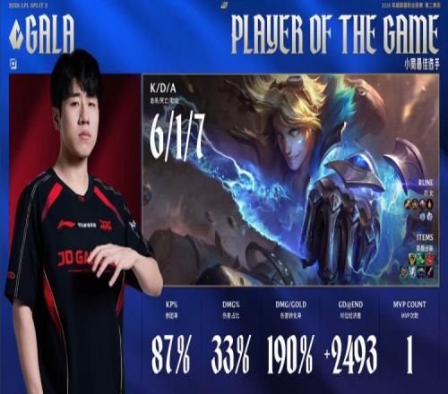 第二局JDG凭借出色的资源置换与后期团战韧性成功扳回一城。前期GALA伊泽瑞尔在小龙团斩获一血,配合Xiaoxu鳄鱼的进场帮助JDG确立了1.5k经济优势。