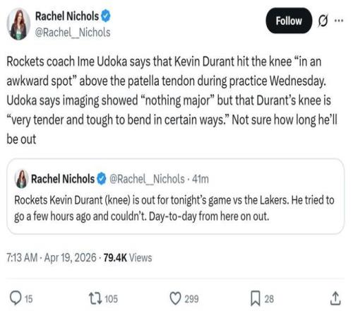 其中ESPN记者Tim MacMahon率先表示,杜兰特是在本周的训练中右膝受伤,但问题并不严重,火箭对他的膝盖状况持乐观态度,认为这不会对这轮系列赛造成重大影响。