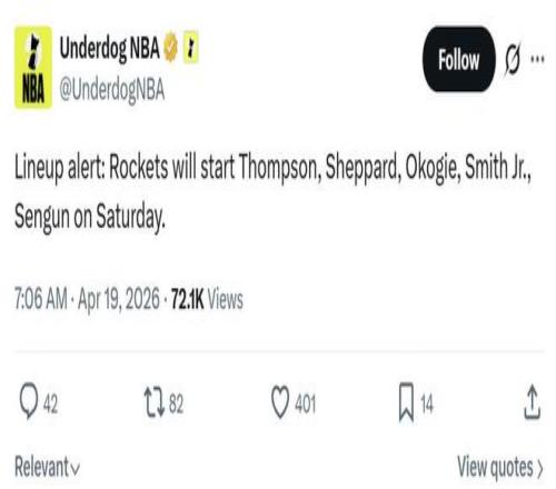 随着杜兰特因伤缺席G1,火箭队首发也公布,分别是:阿门、谢泼德、奥科吉、小贾与申京。