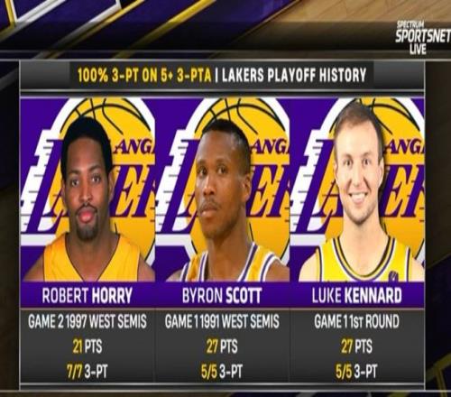 要知道,肯纳德一人就5投全中,湖人季后赛队史单场5+三分&命中率100%仅3人,分别是霍里、斯科特以及肯纳德。