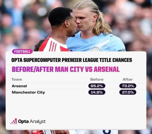 然而,Opta的超级计算机却给出了一个有些“反直觉”的概率预测。数据显示,在本场比赛开始前,阿森纳的夺冠概率为85.2%,曼城则为14.8%;而本场比赛结束后,阿森纳的夺冠概率降至73%,曼城的夺冠概率上升至27%,阿森纳的夺冠概率依旧远超曼城。