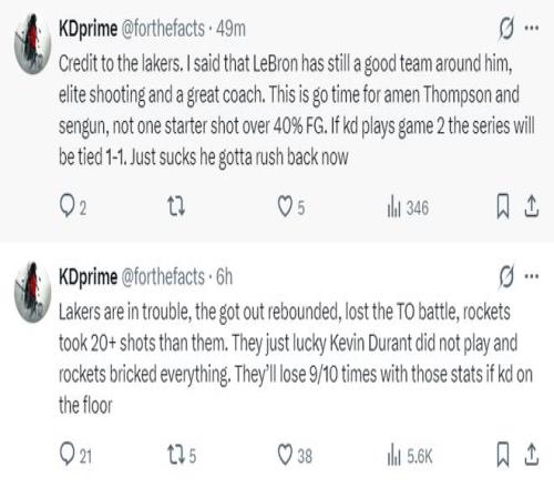 休媒:火箭队的篮板球比湖人多20+,火箭队就输在没有杜兰特,他们有太多轻松的投篮机会未能命中,如果杜兰特能登场的话,湖人十有八九会输球。