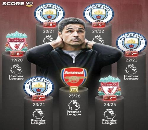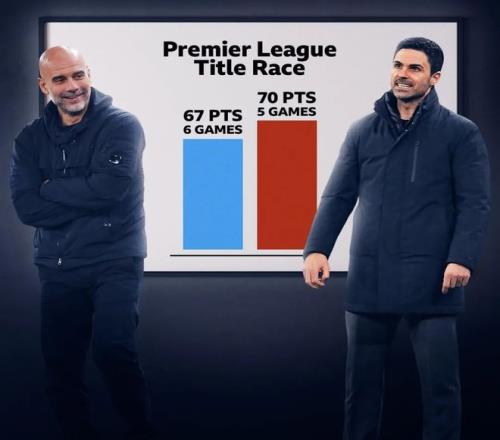 两队分别剩下5轮、6轮联赛,3分的分差,如果落后的曼城最终真的逆转夺冠,那么阿尔特塔的阿森纳,将会迎来英超四连亚。