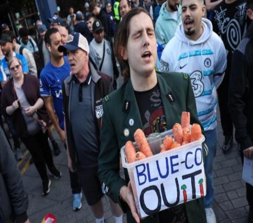 切尔西球迷手持胡萝卜抗议BlueCo,它象征着“空头支票”