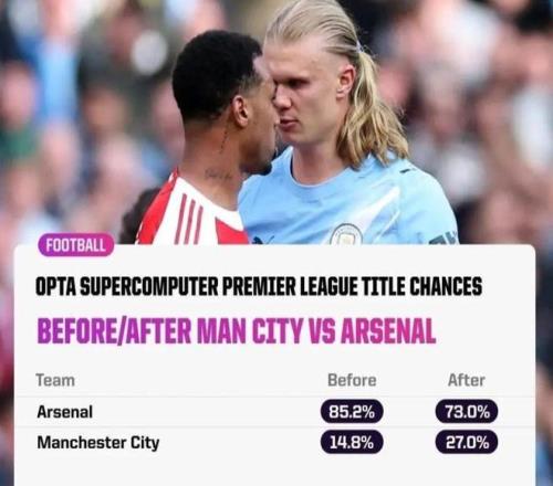 即便目前阿森纳积70分领跑,曼城积67分紧随其后,从夺冠概率来看,阿森纳依旧以73%遥遥领先曼城的27%,但谁都知道,接下来蓝月亮军团的将士们只要做好自己,确保余下的6轮比赛保持全胜,枪手的领跑优势和夺冠概率,最终都只是一个笑话。