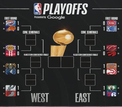 北京时间4月20日,NBA季后赛首轮G1全部结束(客队在前):魔术112-101活塞、太阳84-119雷霆、76人91-123凯尔特人、开拓者98-111马刺、火箭98-107湖人、老鹰102-113尼克斯、森林狼105-116掘金、猛龙113-126骑士。