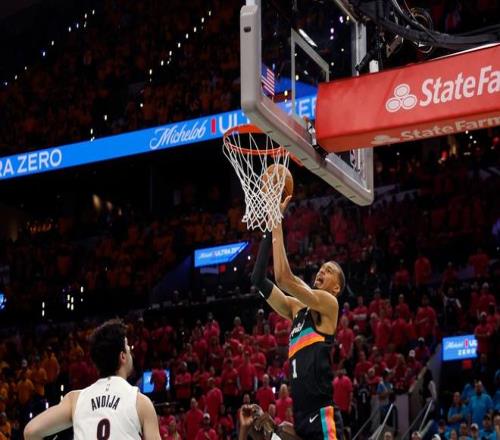 他从后场运球推进,一记背后运球避开阿夫迪亚的抢断,然后在前场直面阿夫迪亚的防守,运球往右边突破却突然转身从中路撕开防线,杀到禁区将球放进篮筐。文班亚马展现了出色的控球技术,能像外线球员一样灵活运球突破。