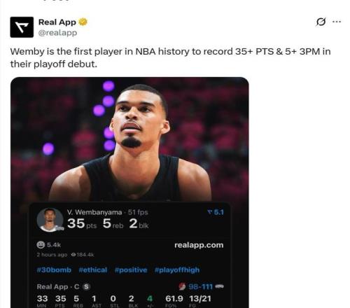 值得关注的是,文班亚马还创下了NBA历史第1的神迹。数据显示,文班亚马成为NBA历史上首位季后赛首秀就砍下至少35分且命中5三分的球员。