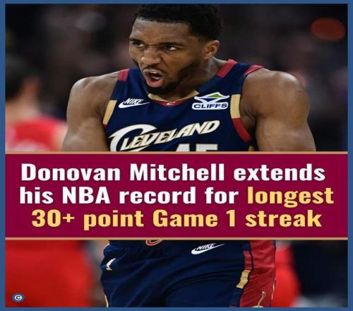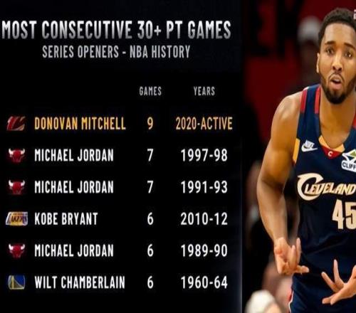 凭借本场比赛,米切尔连续9次在系列赛第一战打出30+。