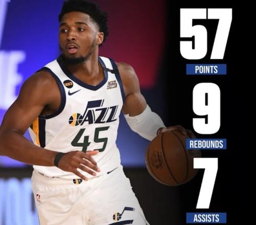其中最爆炸的一场,是2020年对阵掘金的系列赛首战,米切尔出战43分钟,33投19中,轰下57分9篮板7助攻,位居季后赛历史第三高分。