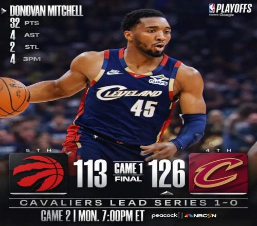 昨日东部季后赛首轮第一战,骑士以126-113击败猛龙,拿下系列赛开门红。对于骑士而言,是率先拿下系列赛优势,但对于米切尔而言,这又是一场历史时刻。