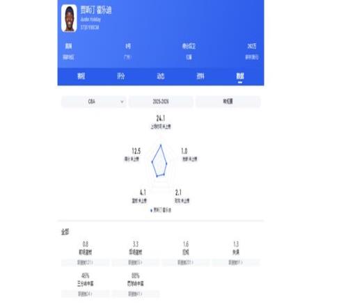 霍勒迪是出色的侧翼投手,拥有接球投、持球投等能力。本赛季他的场均三分命中率高达47%,该数据排在外援榜单中首位,而且比自己的投篮命中率还高。