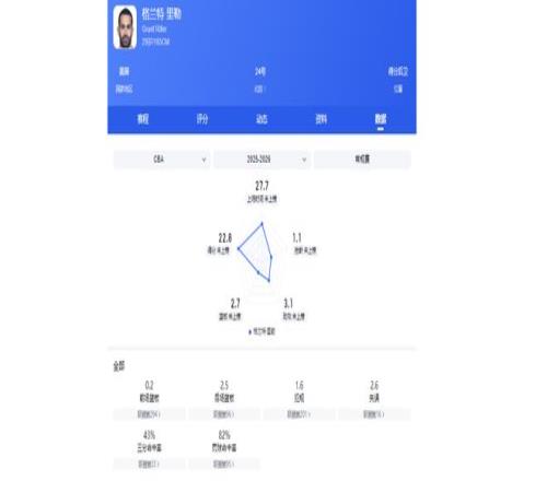 此外,他场均还能为球队贡献4.1篮板2.1助攻1抢断,同时仅1.3次失误,表现非常全面。