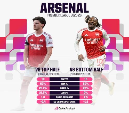北京时间4月20日,在本赛季英超争冠进入白热化阶段的情况下,来自Opta的统计显示,阿森纳本赛季面对积分榜下半区球队有着十分稳定的表现。