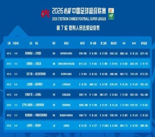 刚刚,中国足协在官方社交账号上公布2026赛季中超联赛第7轮裁判人员选派安排表。本轮的焦点战辽宁铁人主场与大连英博的辽宁德比,足协并没有安排国际级裁判执哨,而是选择了此前因错漏判缺席多轮的裁判。
