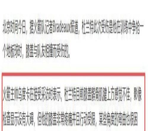 谁能想到,火箭冲冠最关键的节点,当家核心杜兰特居然在训练里翻了车。好好拼个地板球,居然和队友撞到一起伤了膝盖,连G1都没撑住没法上场,好好的主场硬生生输了湖人,现在大比分0-1落后这事说起来真的挺意外,杜兰特的伤不是G1拼比赛拼出来的,是4月16日队内训练出的岔子。当时他扑地板球拼得太凶,没留神和队友撞了个正着,右膝盖结结实实怼了一下,当场就疼得练不下去了。队里立马安排他做了核磁共振,万幸没伤到骨头也没撕裂韧带,不算结构性的大伤。最后确诊是右髌腱深度挫伤,说疼不疼但一发力就遭罪。