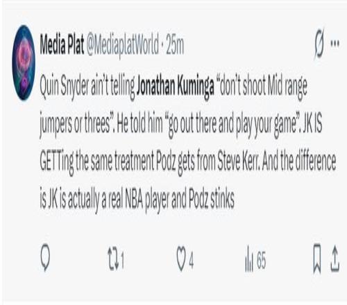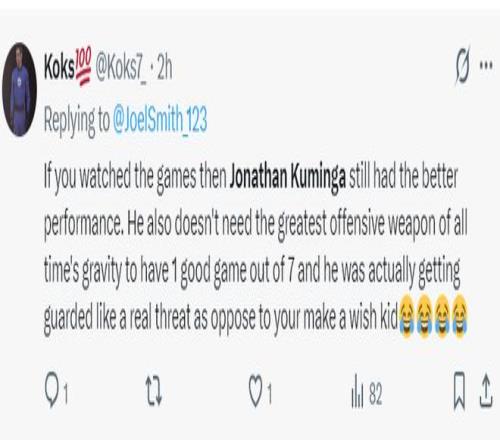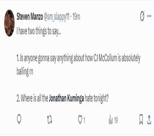 美球迷:如果你们看了比赛就会知道库明加有多么出色。他不需要球队中有那种历史级的超巨吸引包夹,他自己就可以创造得分机会,他的防守也颇具威胁。